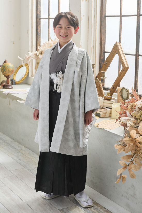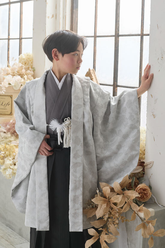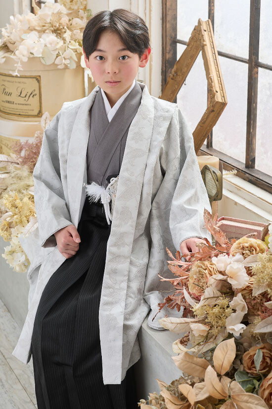 格式高い地模様の羽織に、ブラックの袴を合わせて。