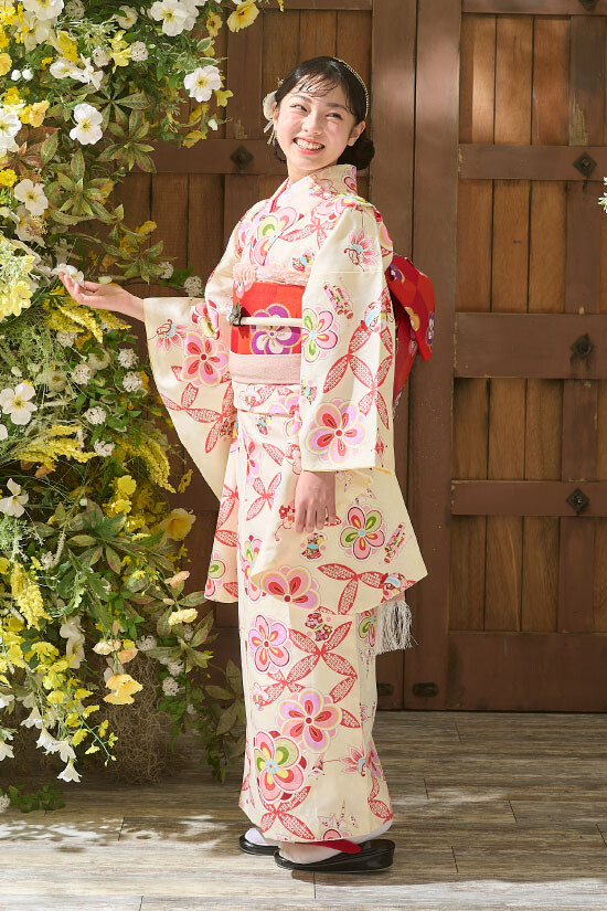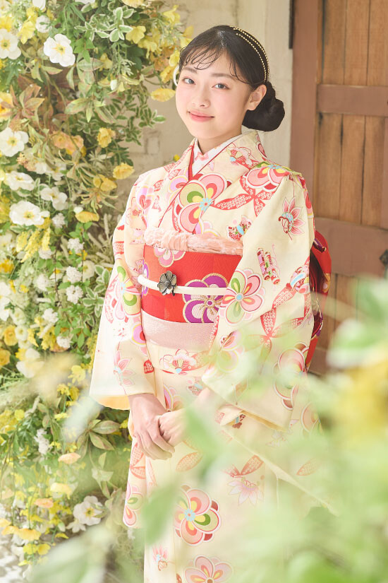 古典的な柄が淡い色の生地と調和した一着。赤い帯と合わせて、華やかな雰囲気に。