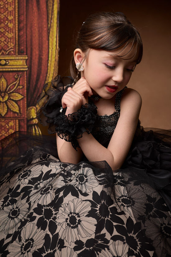 クラシカルな花模様が印象的なロングドレス。ふわふわのリボンでプリンセスコーデに。
