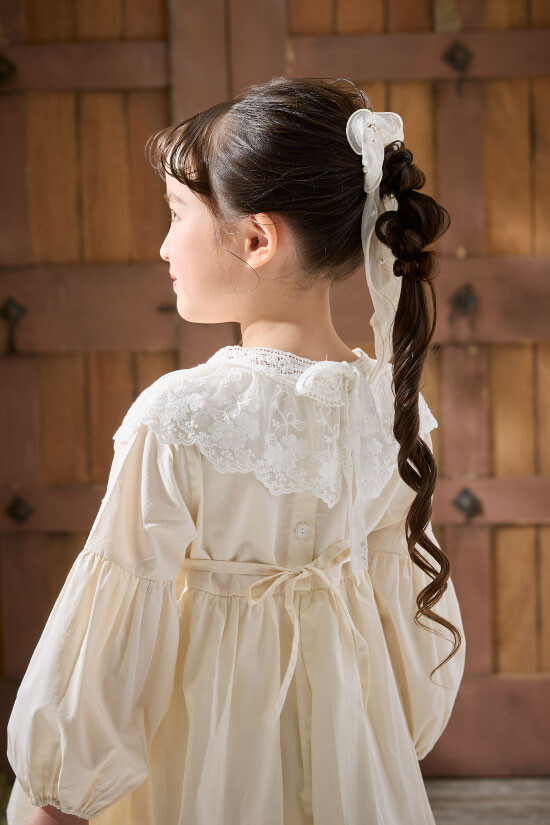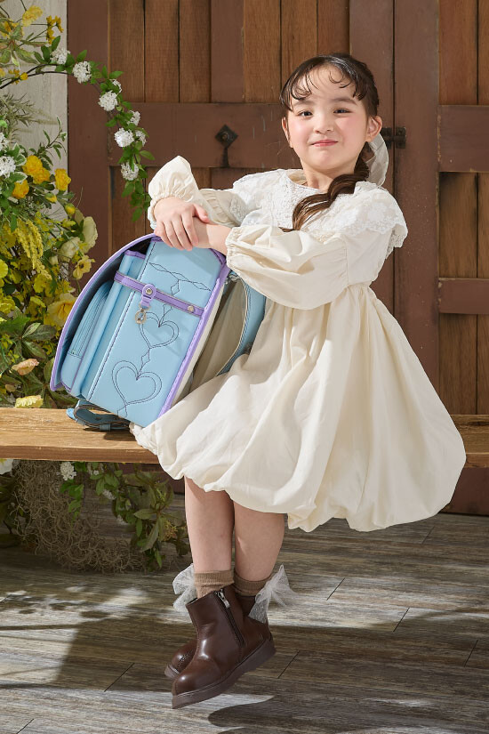 淡いイエローがフレッシュなショート丈のドレス。入学の記念にランドセルとの相性も◎
