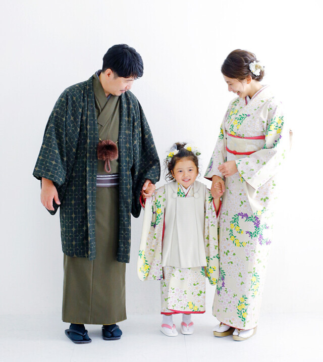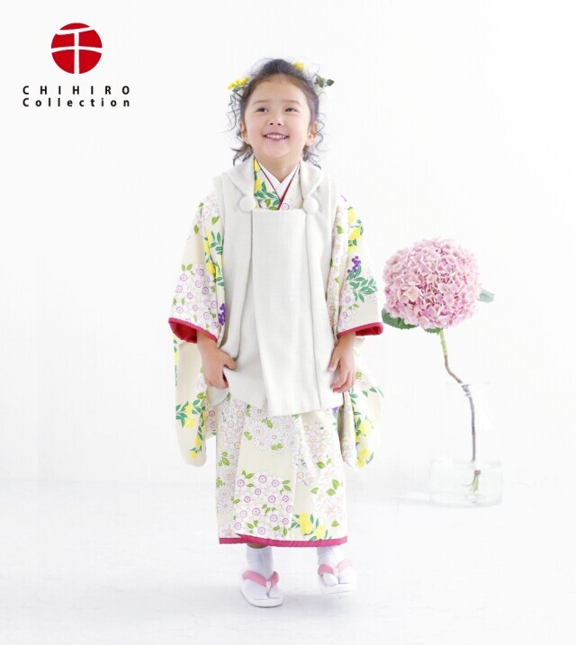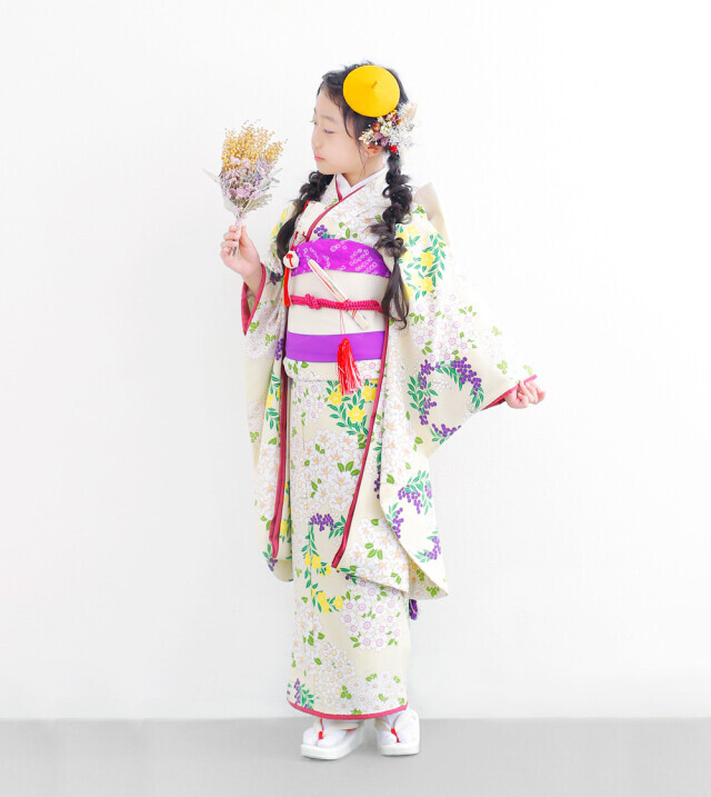 ナチュラルな色使いで、女の子を圧倒的キュートに魅せてくれるボタニカル柄の着物。