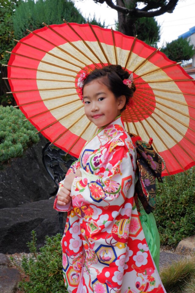 かわいい晴れ着で、スタジオでの家族写真いかがですか?